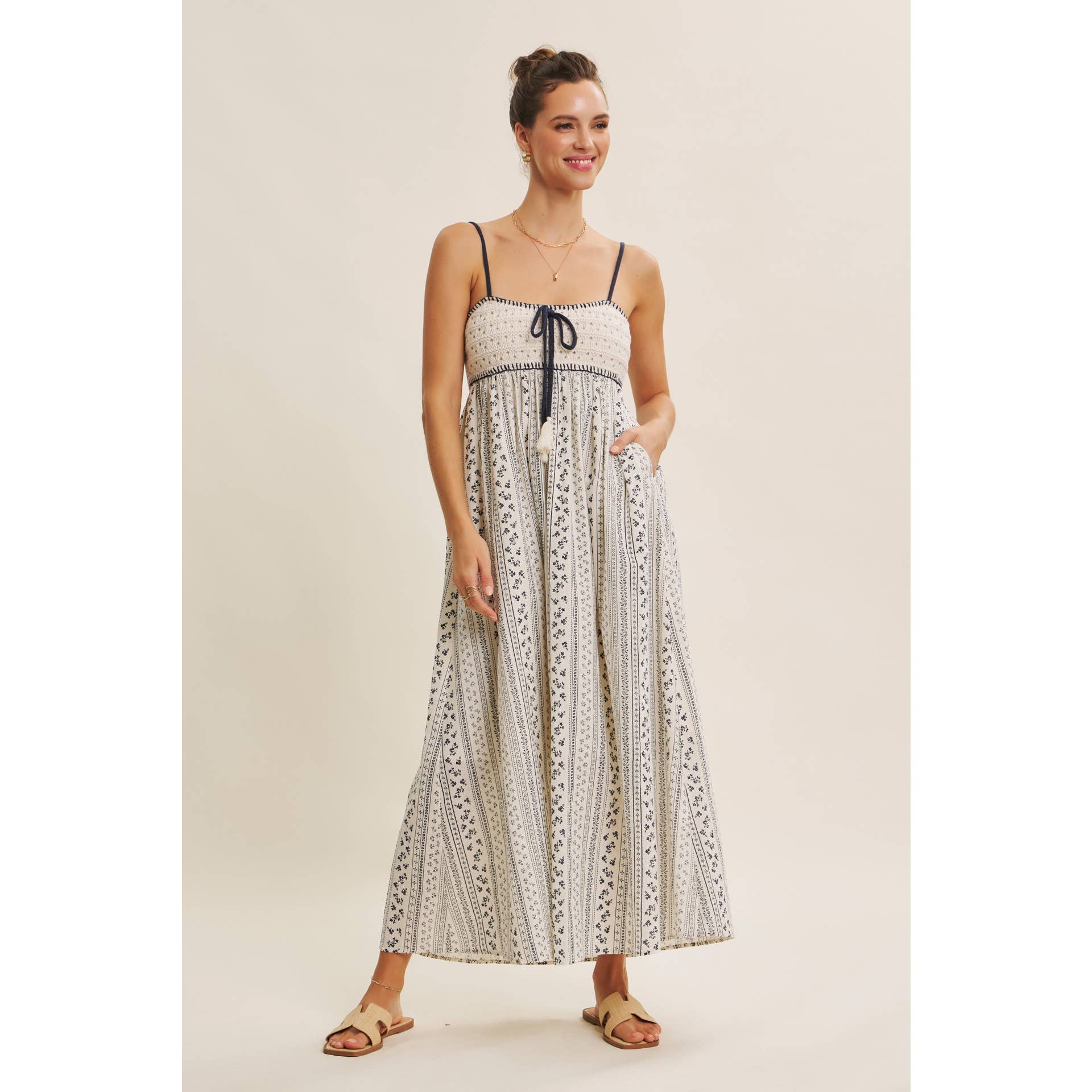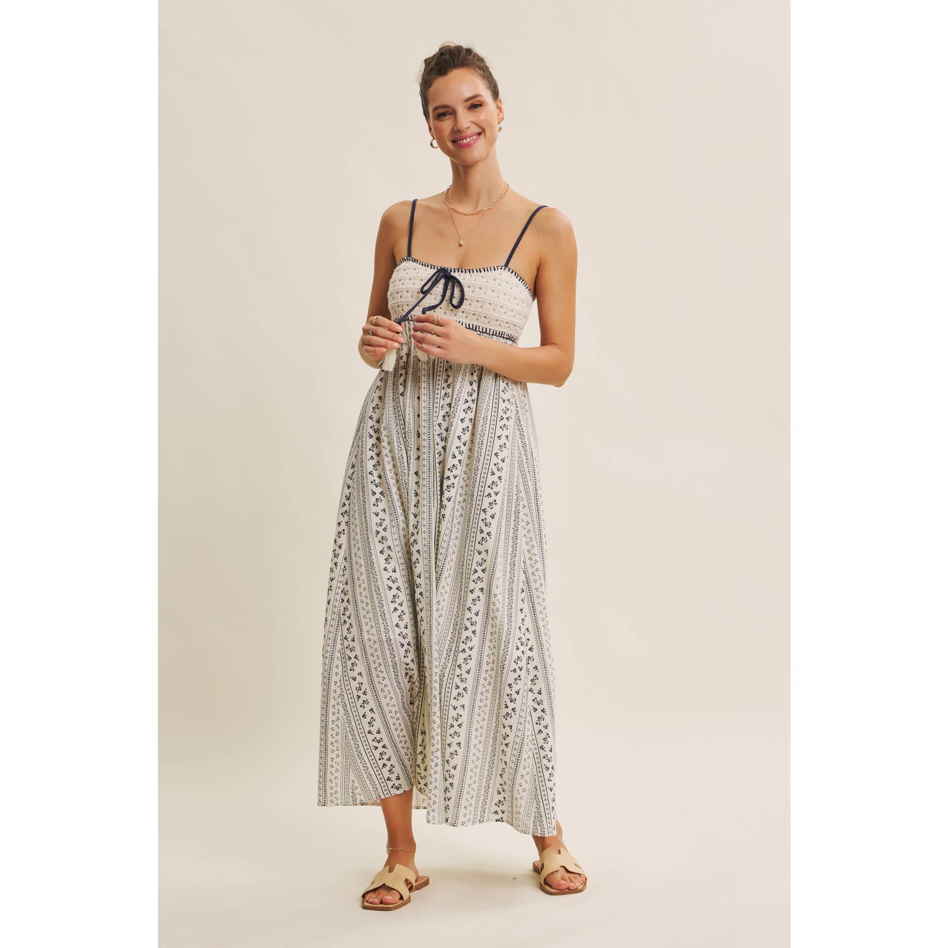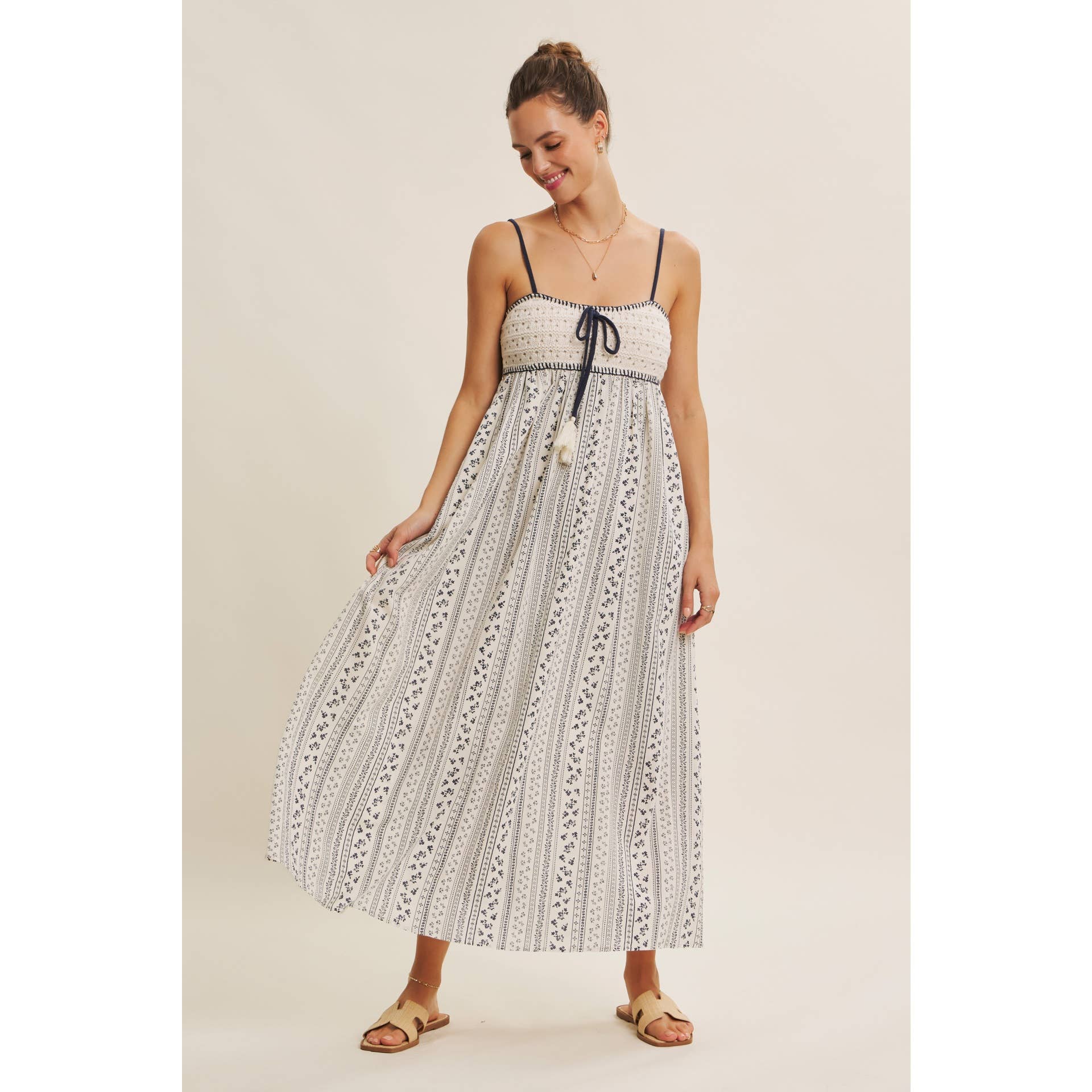 A bohemian dream for sun-soaked days. This romantic maxi dress blends artisanal charm with breezy elegance. The hand-crochet sweater bust and whipstitch detailing bring a crafted feel, balanced by the flowy cotton skirt adorned with soft embroidered stripes. A tasseled bow adds a playful touch, while the smocked back ensures an easy, flattering fit. Finished with side pockets and adjustable straps, it’s the perfect blend of style and comfort. Ideal for picnics, beach strolls, or weekend escapes, this dress captures the essence of carefree summer romance. Features - Crochet sweater bust - Maxi dress - Vertical stripe embroidery print - Sleeveless - Adjustable spaghetti straps - Smocked back - Side pockets - Whipstitch detail - Front bow with tassels - Lined Size + Fit Model is 5'9.5" and wearing a size Small. Please refer to our size chart.