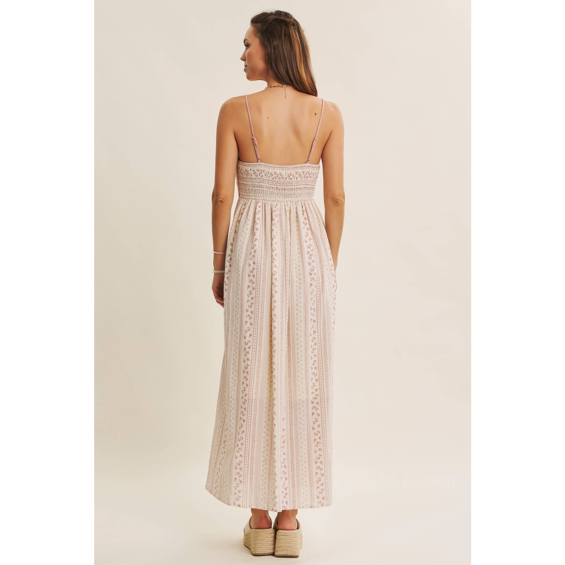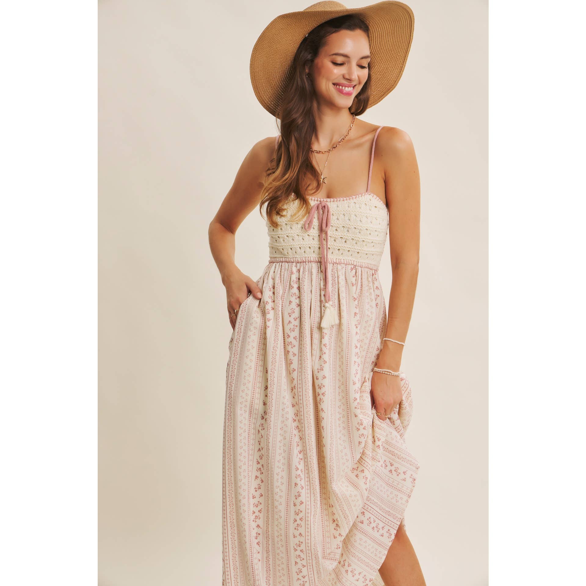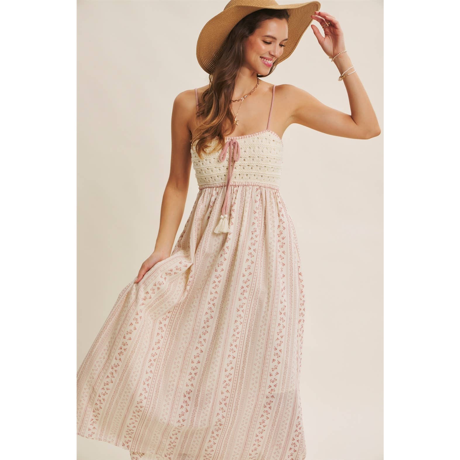 A bohemian dream for sun-soaked days. This romantic maxi dress blends artisanal charm with breezy elegance. The hand-crochet sweater bust and whipstitch detailing bring a crafted feel, balanced by the flowy cotton skirt adorned with soft embroidered stripes. A tasseled bow adds a playful touch, while the smocked back ensures an easy, flattering fit. Finished with side pockets and adjustable straps, it’s the perfect blend of style and comfort. Ideal for picnics, beach strolls, or weekend escapes, this dress captures the essence of carefree summer romance. Features - Crochet sweater bust - Maxi dress - Vertical stripe embroidery print - Sleeveless - Adjustable spaghetti straps - Smocked back - Side pockets - Whipstitch detail - Front bow with tassels - Lined Size + Fit Model is 5'9.5" and wearing a size Small. Please refer to our size chart.