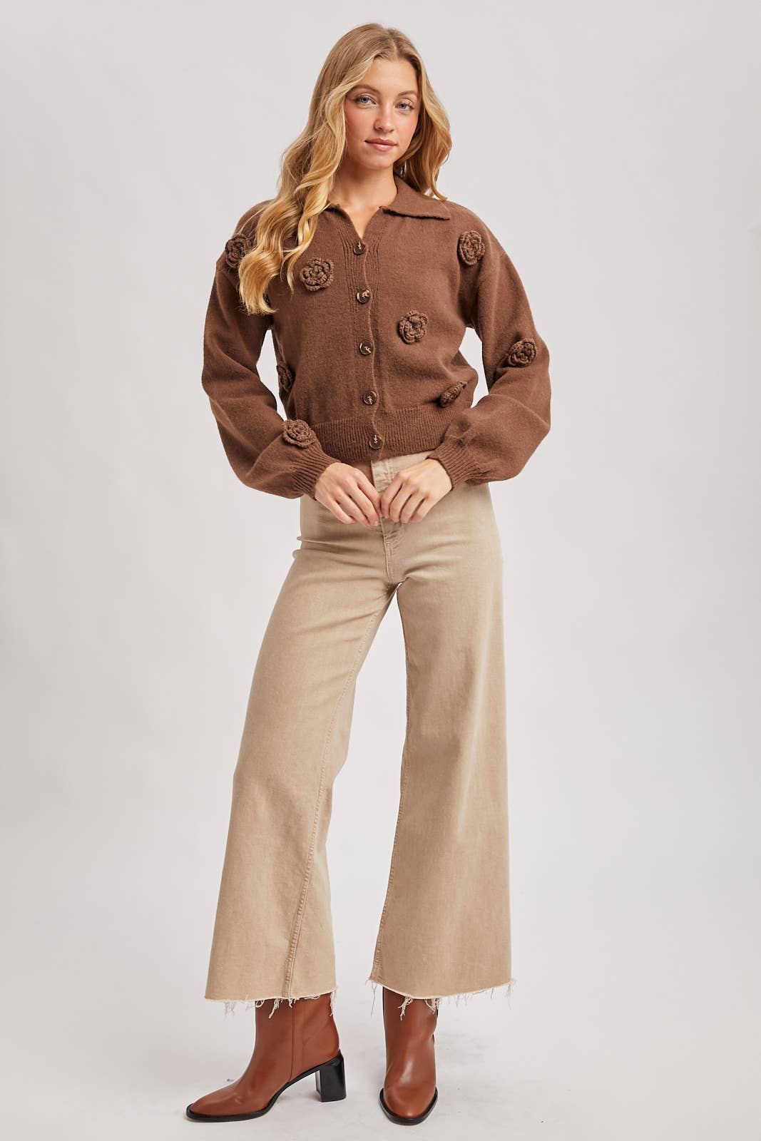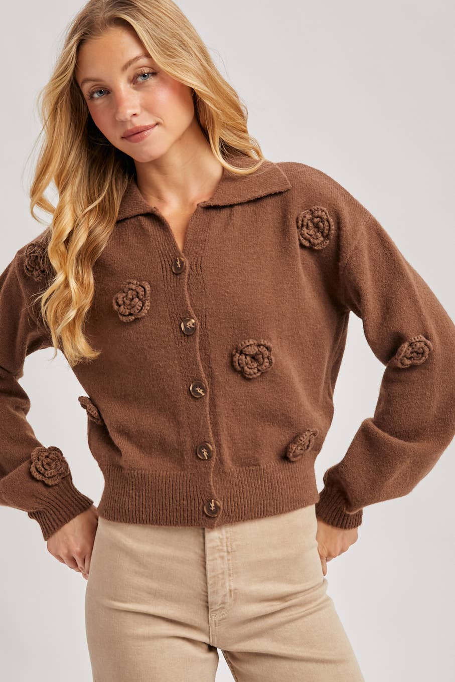 The floral embroidery button-down collared cardigan is a charming blend of classic style and feminine detail. It features delicate floral embroidery throughout, adding a touch of elegance to the design. The button-down front allows for versatile styling, while the collared neckline adds a structured and polished look. Crafted from a soft, comfortable knit, this cardigan provides a cozy yet stylish layer for various occasions. It pairs beautifully with dresses, skirts, or jeans, making it a perfect addition to any wardrobe for a chic, effortless look.