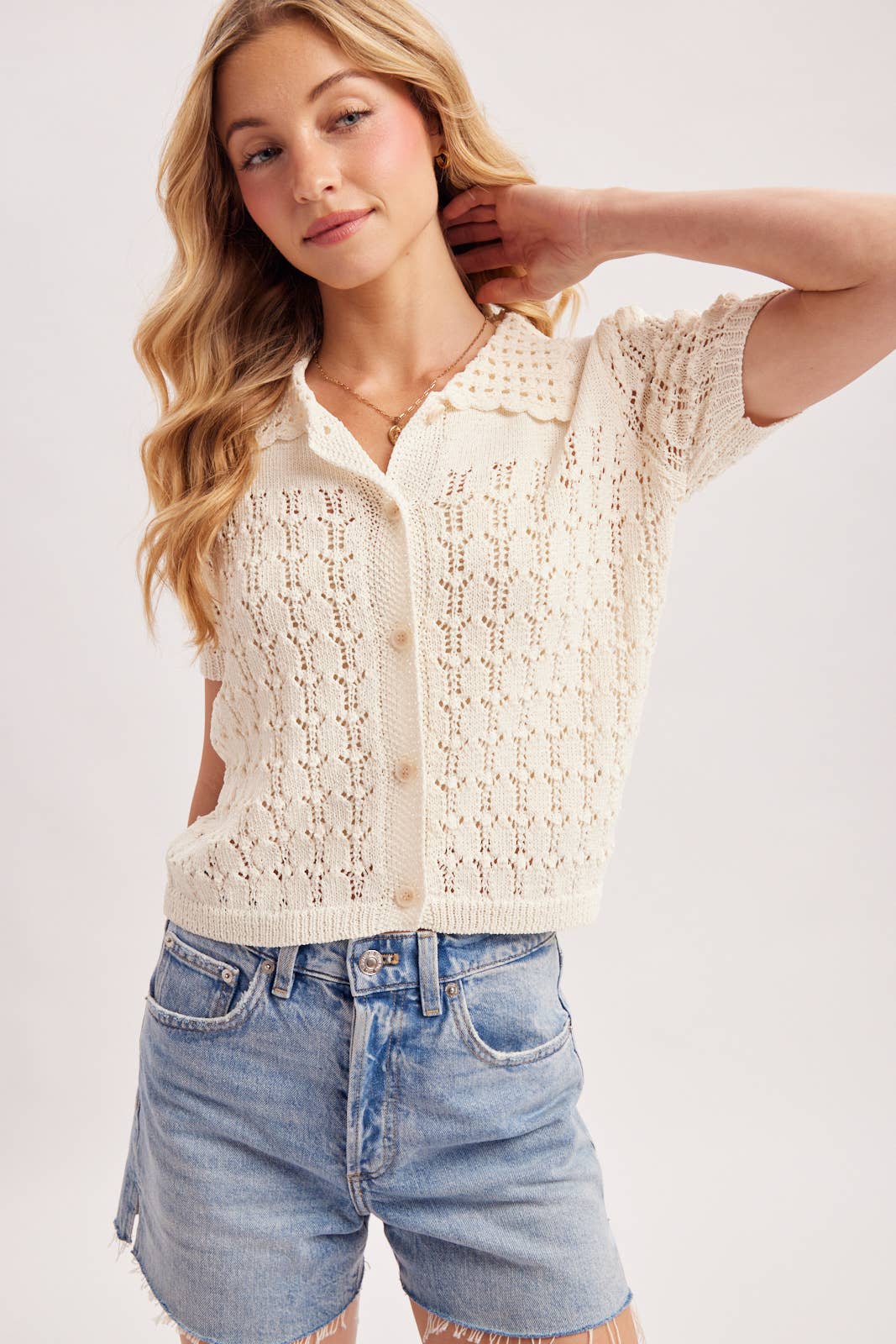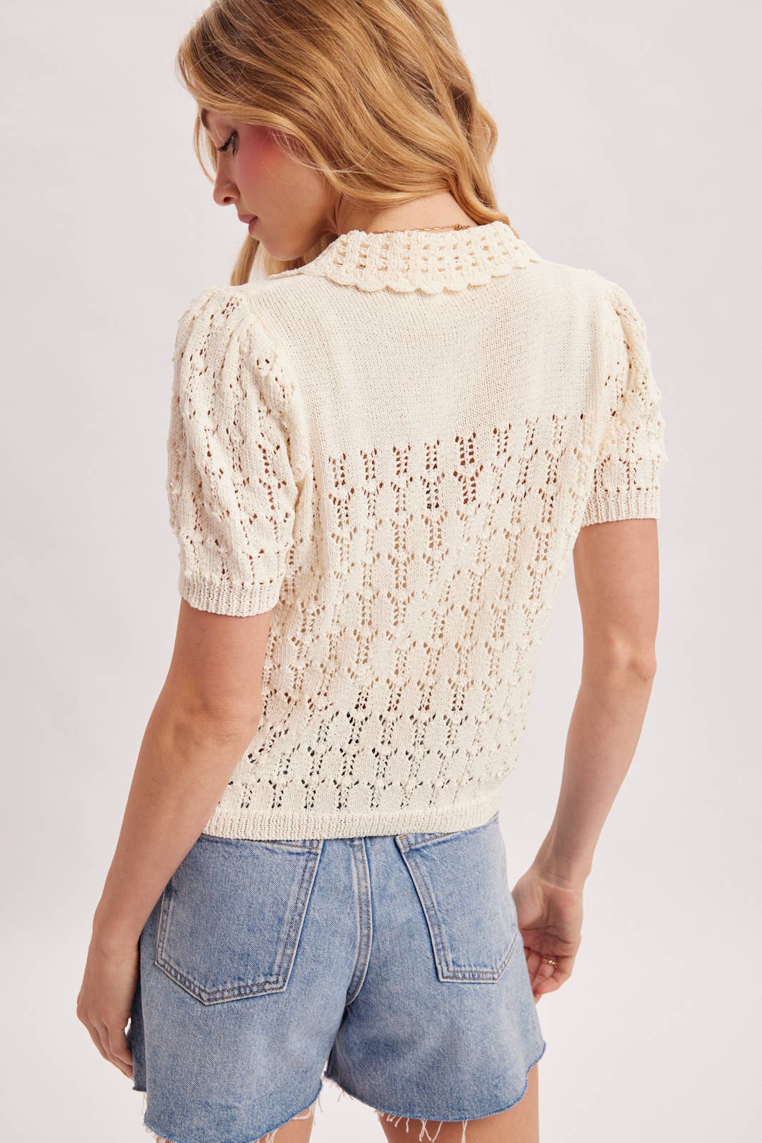 This vintage-inspired top is a delicate short-sleeve cardigan featuring an intricate pointelle open-knit pattern throughout. The garment is designed with a classic spread collar that boasts a feminine scalloped edge, leading down to a functional front button-up closure with small, tonal buttons. Its short sleeves and straight hem are finished with traditional ribbed knit detailing, providing a slightly structured yet comfortable silhouette. The airy, textured fabric gives the piece a soft, romantic feel, making it a versatile choice for styling with high-waisted denim for a modern-retro look.